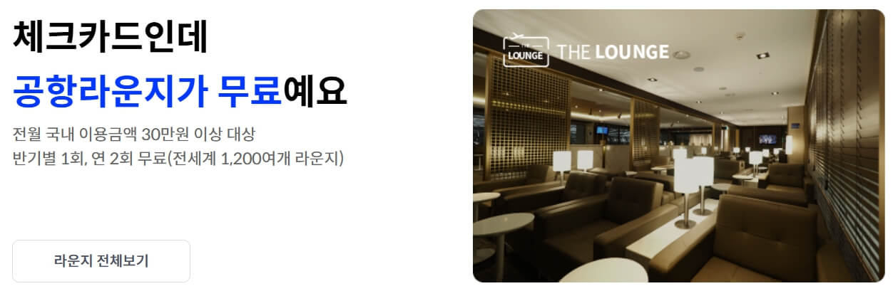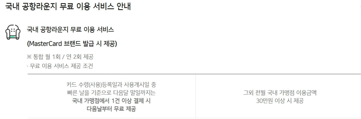 - 전 세계 공항라운지 ☞ 연간 1회 무료 이용 - 전월실적 30만 원 이상 시