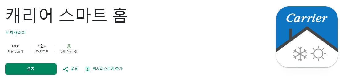 세 번째로 많이 사용하시는 캐리어 제품의 어플은 Carrier Smart Home (캐리어 스마트 홈)입니다. 케리어 스탠드, 천장형 에어컨, 공기청정기에 사용할 수 있는 앱입니다.