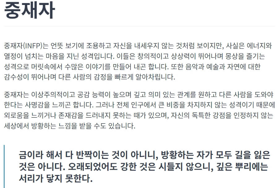 - INFP (중재자): 이상주의적이고 창의적이며, 자신의 신념에 충실합니다. 다른 사람의 감정을 잘 이해합니다.