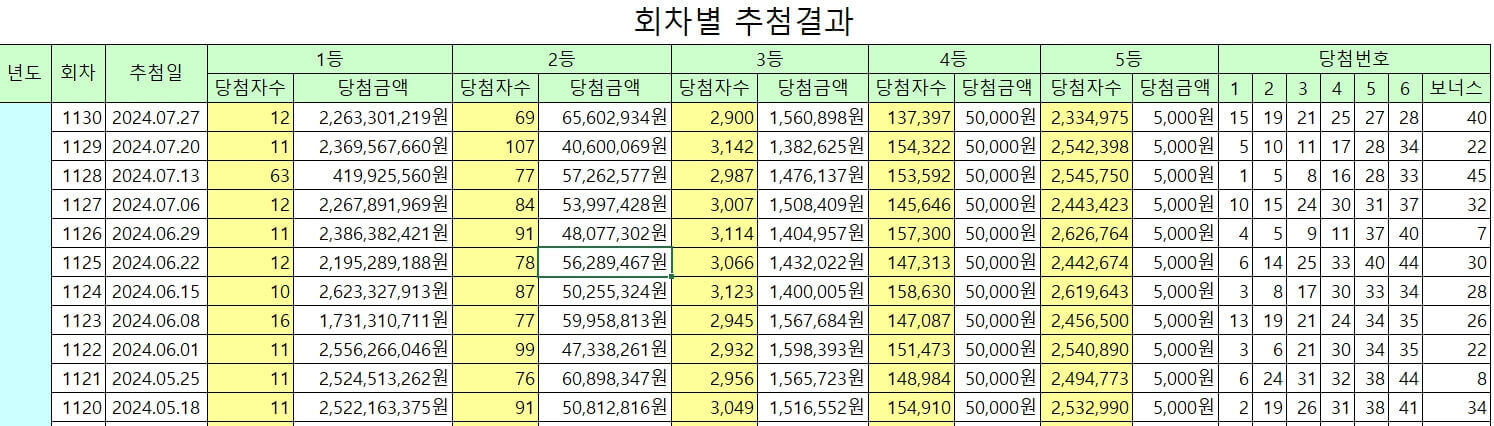 엑셀파일을 다운로드 받으면 회차, 추첨일, 1등부터 5등까지 당첨자 수, 당첨금액, 당첨번호 (+ 보너스 번호)를 확인할 수 있습니다.