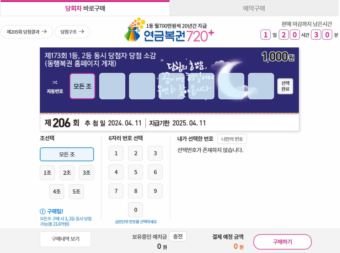 - 연금복권은 현금(가상계좌 이체)으로 구매할 수 있습니다. (카드구매 불가)