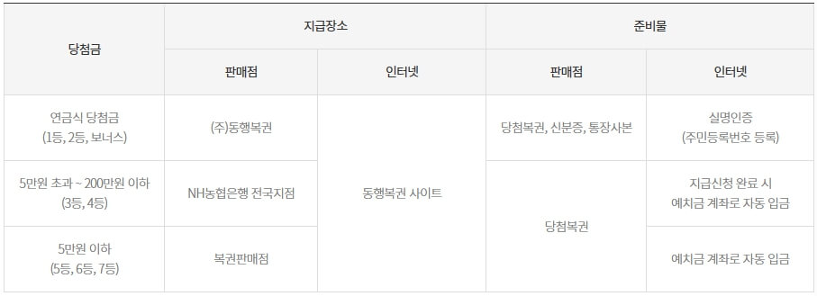 - 세금 (소득세 및 주민세)을 제외한 당첨금이 다음 달 20일부터 지급됨.