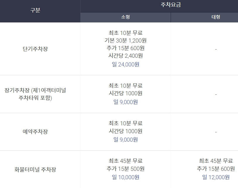 단기주차장, 장기주차장, 예약주차장, 화물터미널 주차장으로 주차장이 나눠져 있으며 각각의 주차요금은 아래와 같습니다. 제1여객터미널에 있는 예약주차장은 2025년 2월까지 하루 7,000원으로 할인됩니다.