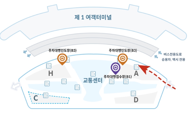 - 차량을 맡기는 장소는 제1여객터미널 단기주차장 (지하 1층)으로 입차하시면 됩니다. 아래 사진에서 위치를 확인하실 수 있습니다.