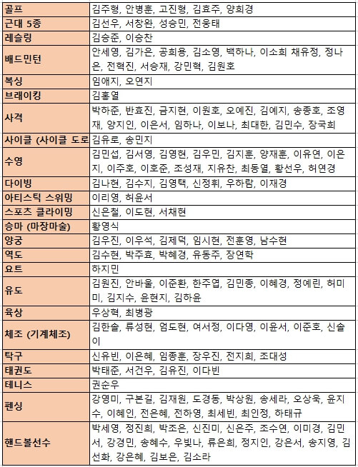 | 기계체조 | 탁구 | 태권도 | 펜싱 |