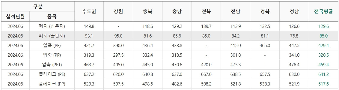 또한 폐지 가격은 수요와 공급에 따라 계속 달라집니다. 지역별 실시간 폐지 가격 및 다른 재활용 자원 (PET, PP 등 플라스틱, 폐유리병, 알루미늄 캔 등 금속류)의 가격은 아래에서 확인하실 수 있습니다.