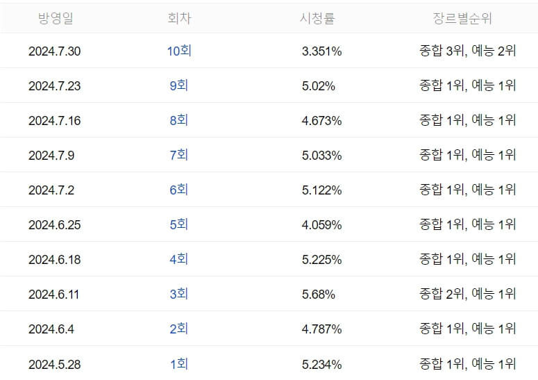 한인톱텐쇼 시청률은 1회 5.234%를 시작으로 계속 4-5%대를 유지하며 동시간대 시청률 1위를 달성했습니다. 최근 10회 시청률이 3.351%로 다소 감소했으며 이는 올림픽과 여름휴가의 영향이 있을 것으로 예상됩니다.
