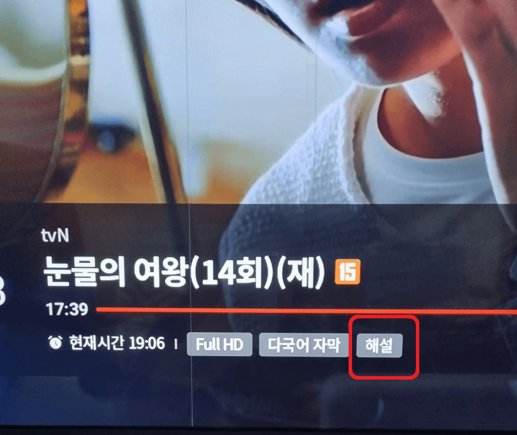 화면 해설방송을 설정하면 화면에 나오는 장면을 성우가 설명해 줍니다. 드라마 주인공들의 대사 외에도 행동이나 표정들을 설명해 주기 때문에 보지 못하더라도 내용을 충분히 이해할 수 있습니다.
