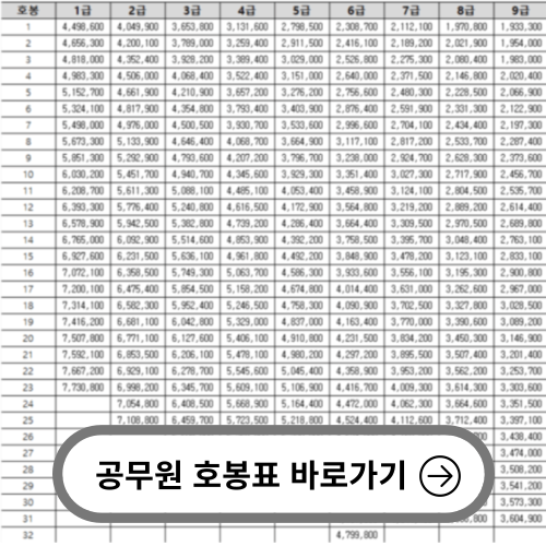 ✅ 공무원의 연봉은 직급(1~9급) 별로 기본급이 차별되며 호봉(1~32호봉)으로 세분화됩니다. 호봉은 1급 입사 시 1호봉으로 시작하여 매년 호봉이 올라가게 됩니다. 따라서 각 공무원의 직위와 경력에 따라 월급이 차등지급됩니다.