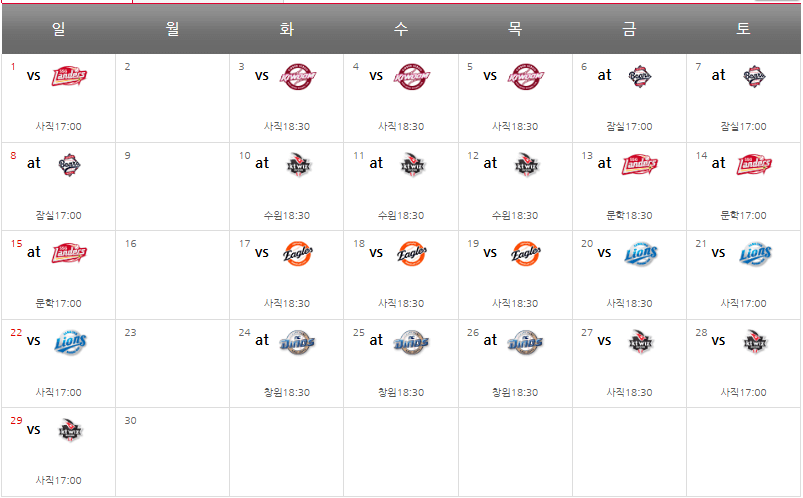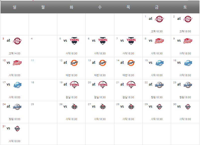 아래의 일정표를 누르시면, 날짜별로 예정된 경기의 상대 팀, 시작 시간, 홈/원정 경기 여부를 보다 크게 보실 수 있습니다.