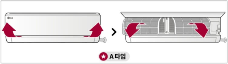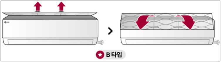 2) 전면커버 (패널) 위치에 따라 필터 분리 방법이 다릅니다. 아래 A타입, B타입 그림을 보고 방법에 따라 패널을 열고 필터를 꺼냅니다.